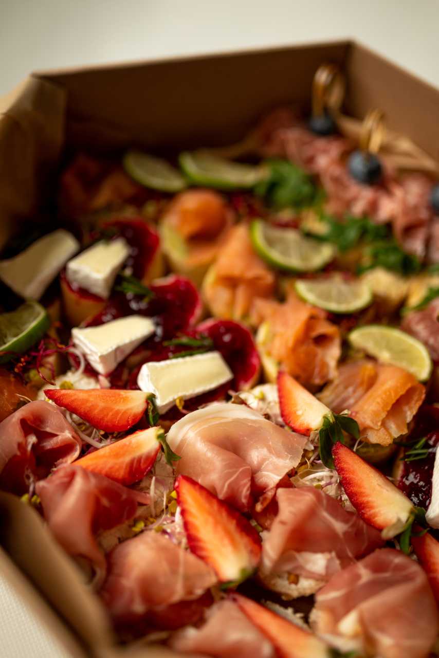 Mix kanapek z wędzonym łososiem, szynką parmeńską, salami, kremem czekoladowym.