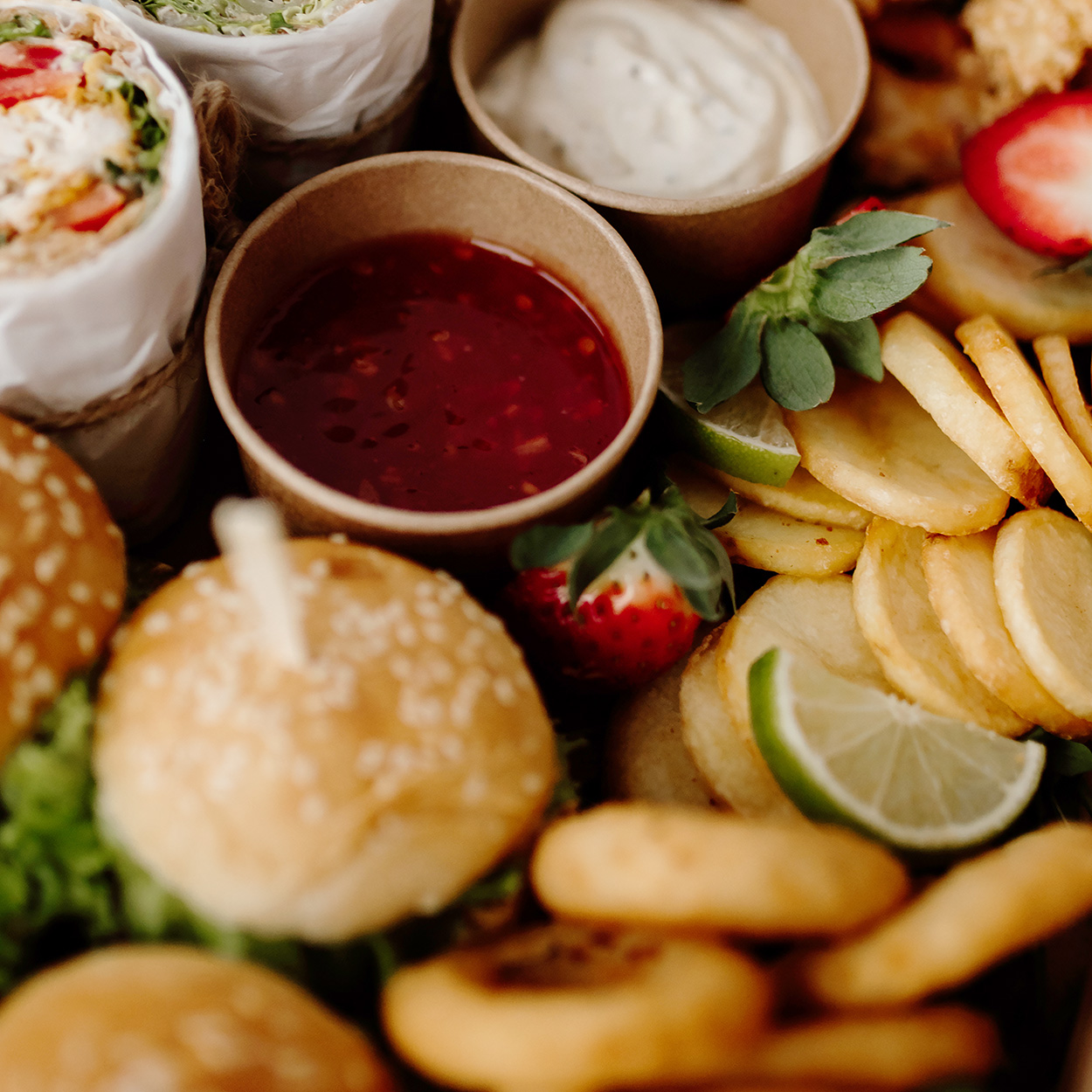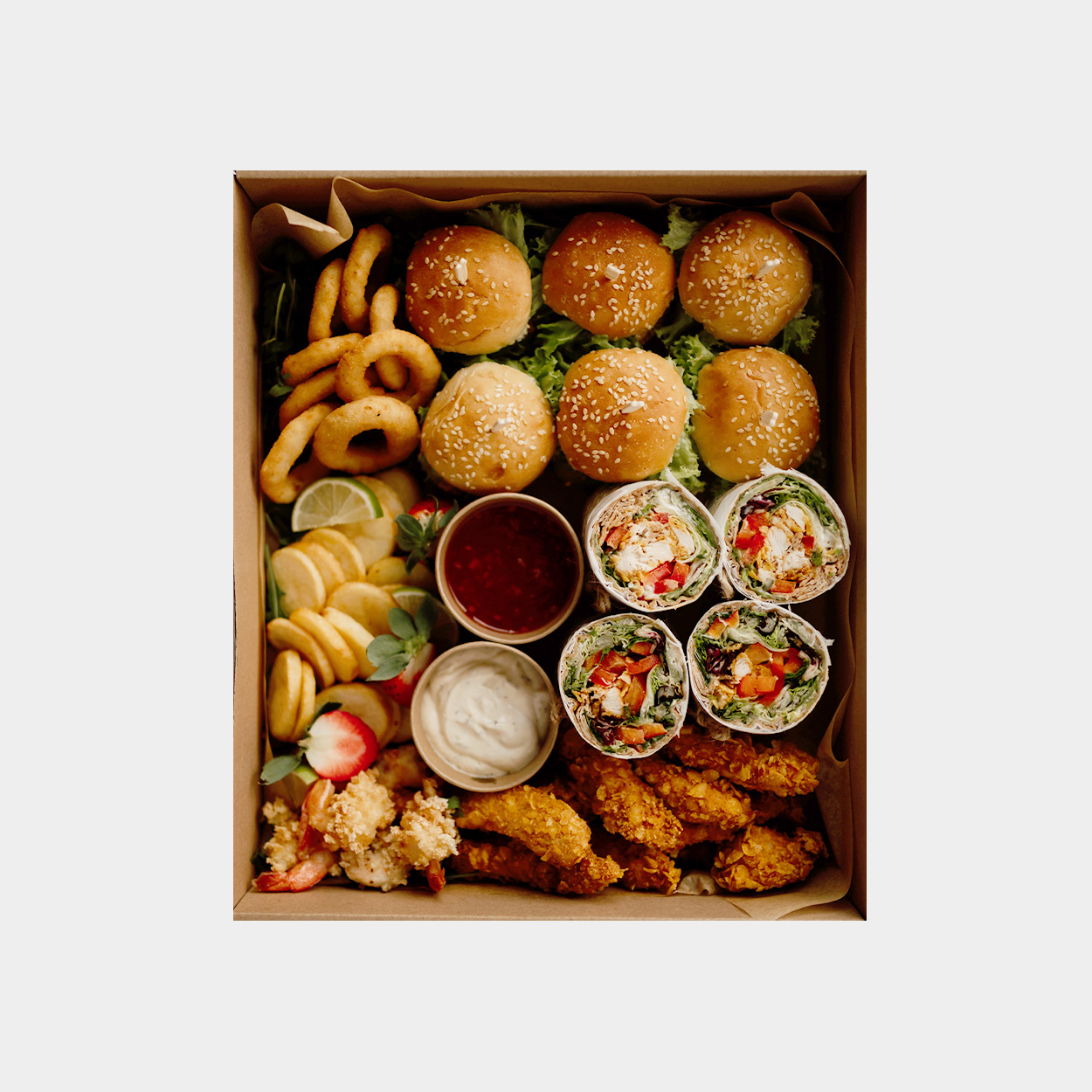 6 mini burgerów, 4 wrapy z kurczakiem, krążki cebulowe, krewetki w tempurze, talarki ziemniaczane, nagetsy. Dedykowane dla 4 osób.