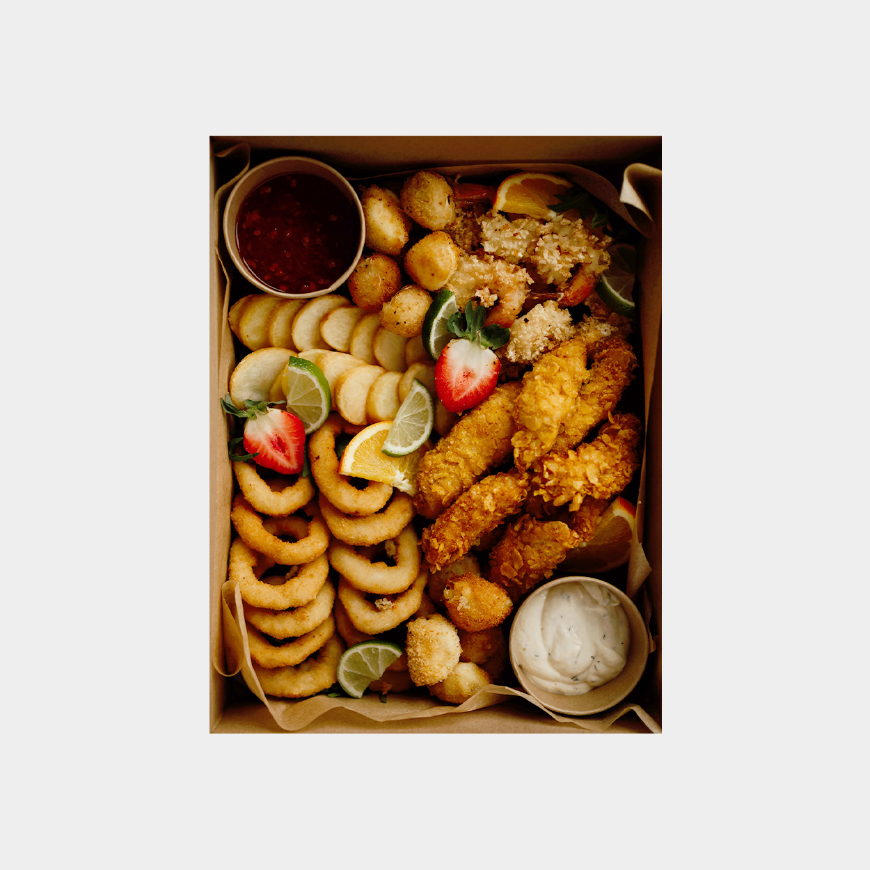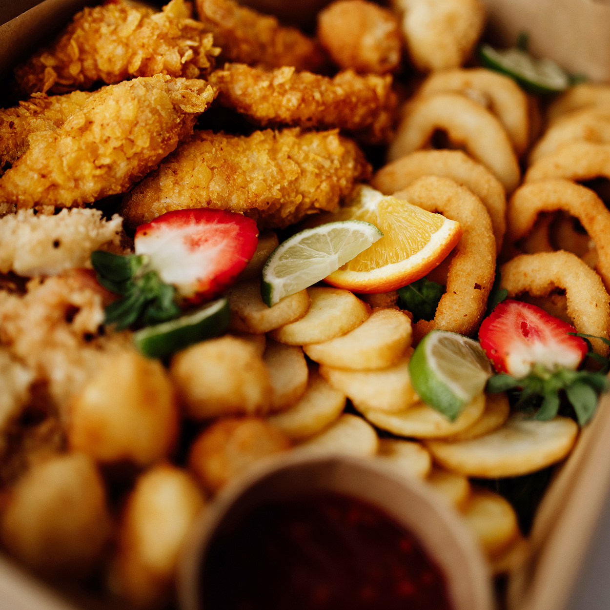 Nagetsy, krążki cebulowe panierowana mozzarella, talarki ziemniaczane, krewetki w tempurze
