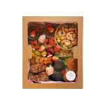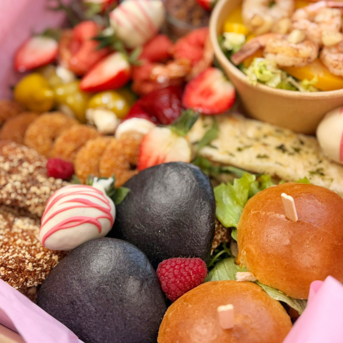 Sałatka z krewetkami, chlebek naan, 2 mini burgery, 2 bułeczki Bao Bao z kurczakiem, 2 czekoladowe deserki, chrupiące polędwiczki z kurczaka, papryczki z nadzieniem śmietankowym, krewetki w różowej tempurze, donaty serowe