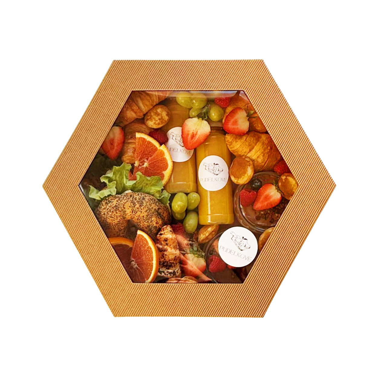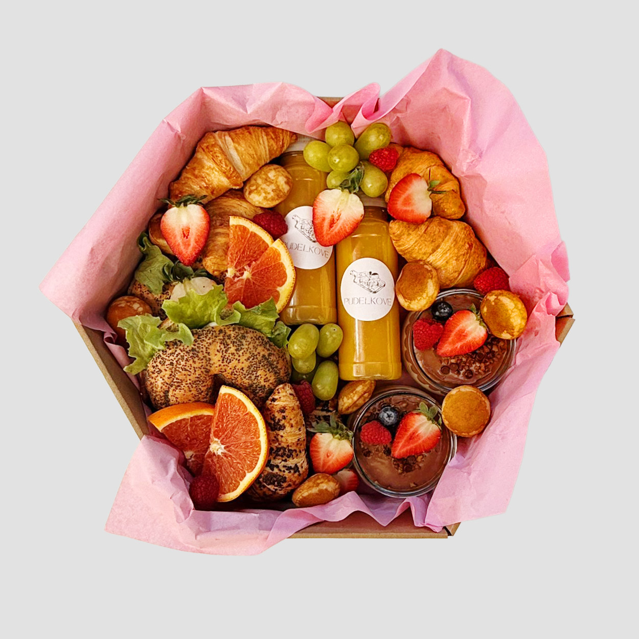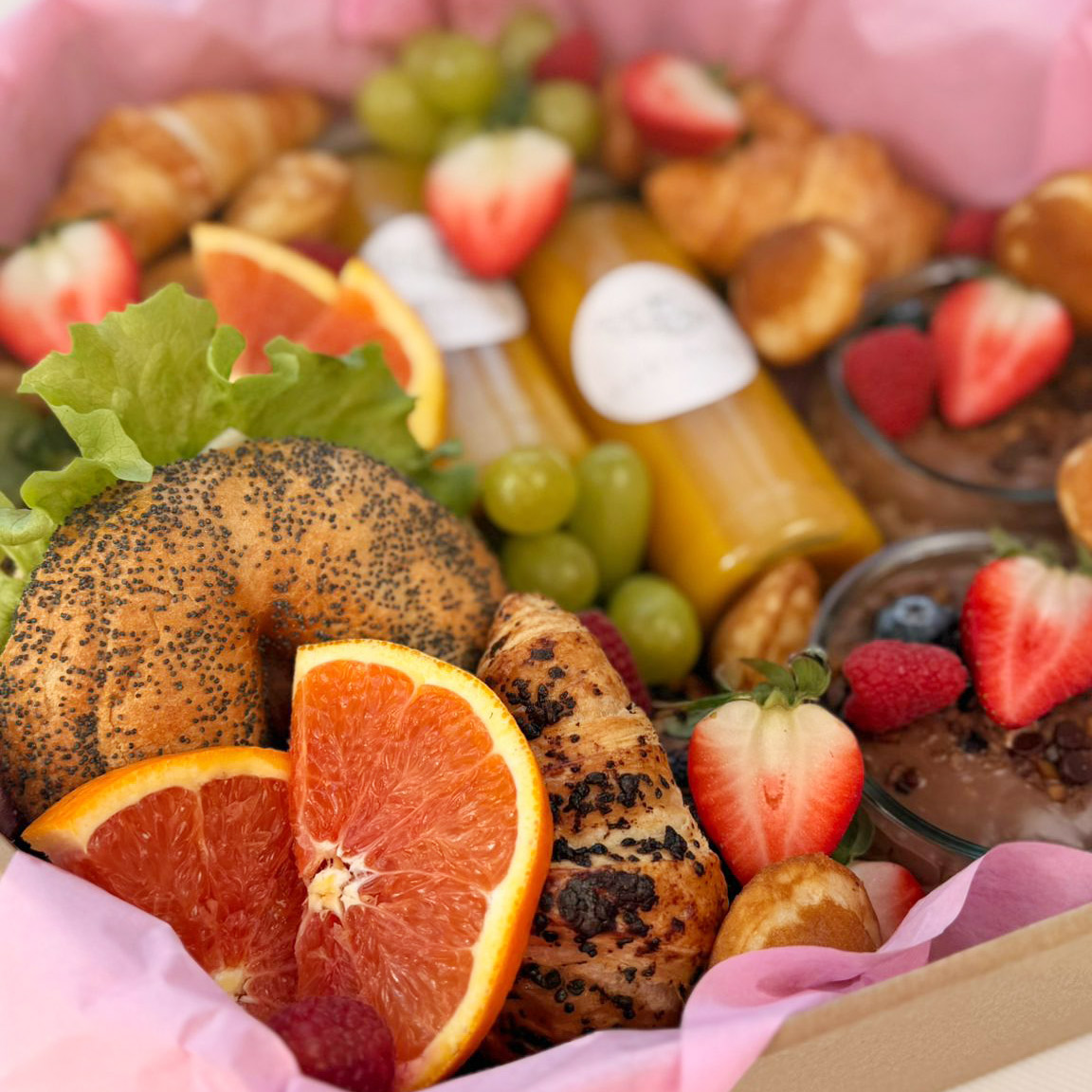 2 soki, 2 czekoladowe deserki, 6 mini croissant z nadzieniem, 2 bajgle z szynką parmeńską, Mini pancake, Owoce